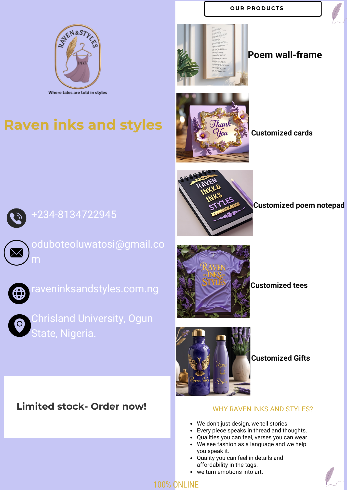 Our creations are more than objects; they are experiences. A garment from us isn’t merely worn it becomes part of your presence. A journal from us isn’t just filled with words it becomes a trusted keeper of your thoughts. A gift from us isn’t just exchanged it becomes a memory, preserved in form and feeling. We believe that what you wear, write in, or gift should speak on your behalf, with grace, authenticity, and intention. This is why every piece is thoughtfully designed, using quality materials, refined craftsmanship, and a careful understanding of the message it is meant to carry. From the first spark of an idea to the final detail, we ensure each creation reflects both our high standards and your unique essence. Whether you seek a garment to wear, a journal to fill, a gift to treasure, or words to keep forever, Raven Inks and Styles delivers refined, custom-crafted creations that transform moments into art. We don’t just make products we create keepsakes that carry stories, preserve emotions, and celebrate individuality.